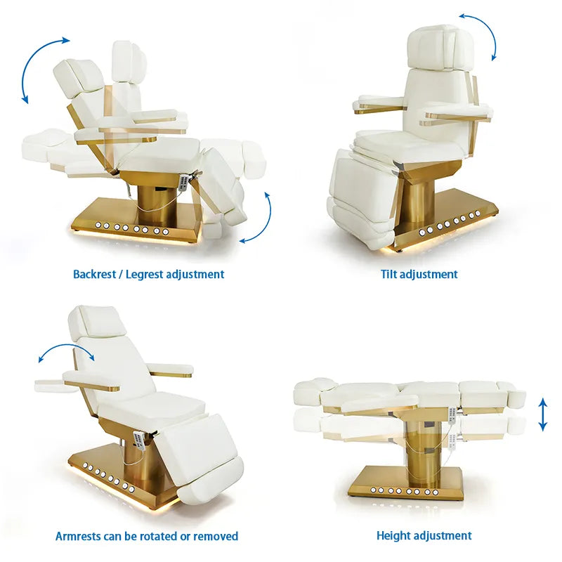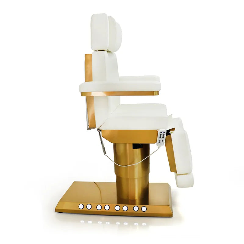 Upgrade your salon with this professional, motorized treatment bed that perfectly balances style, comfort, and durability. Featuring three powerful motors, it allows seamless adjustment of the height, backrest, and legrest, ensuring maximum client comfort during treatments such as facials, massages, and spa services.